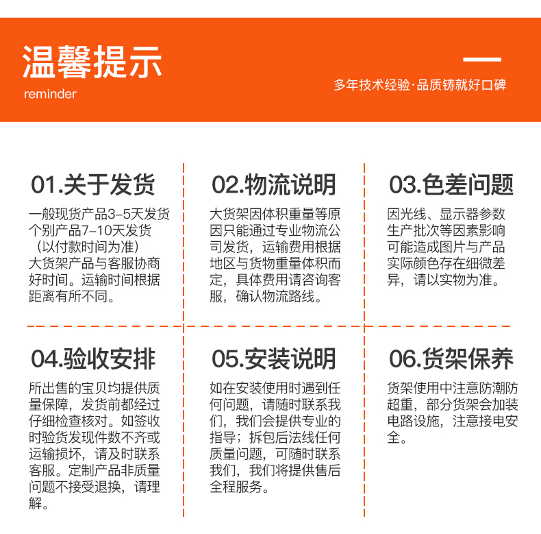 自有強(qiáng)大施工隊(duì)伍,提供現(xiàn)場(chǎng)專(zhuān)業(yè)安裝,有紀(jì)律、有標(biāo)準(zhǔn)的現(xiàn)場(chǎng)施工,直到客戶(hù)100%滿(mǎn)意,常規(guī)庫(kù)存產(chǎn)品24小時(shí)內(nèi)發(fā)貨,整店定制產(chǎn)品5-15日交貨